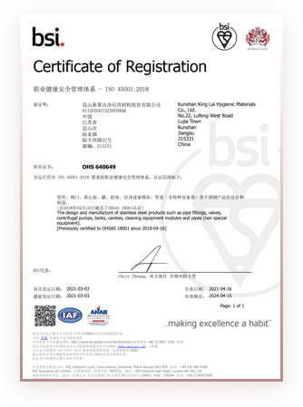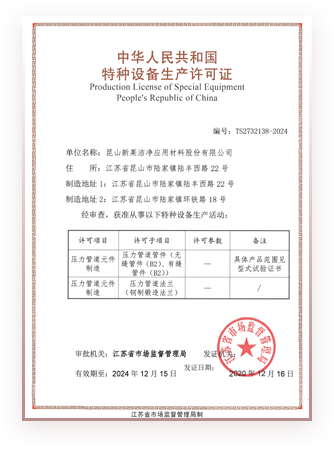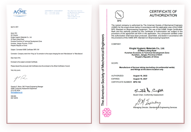 The named company is authorized by The American Society of Mechanical Engineers(ASME) for the scope shown below in accordance with the applicable rules of the ASMEBPE Standard on Bioprocessing Equipment. The use of the ASME Single Certification Mark and the authority granted.